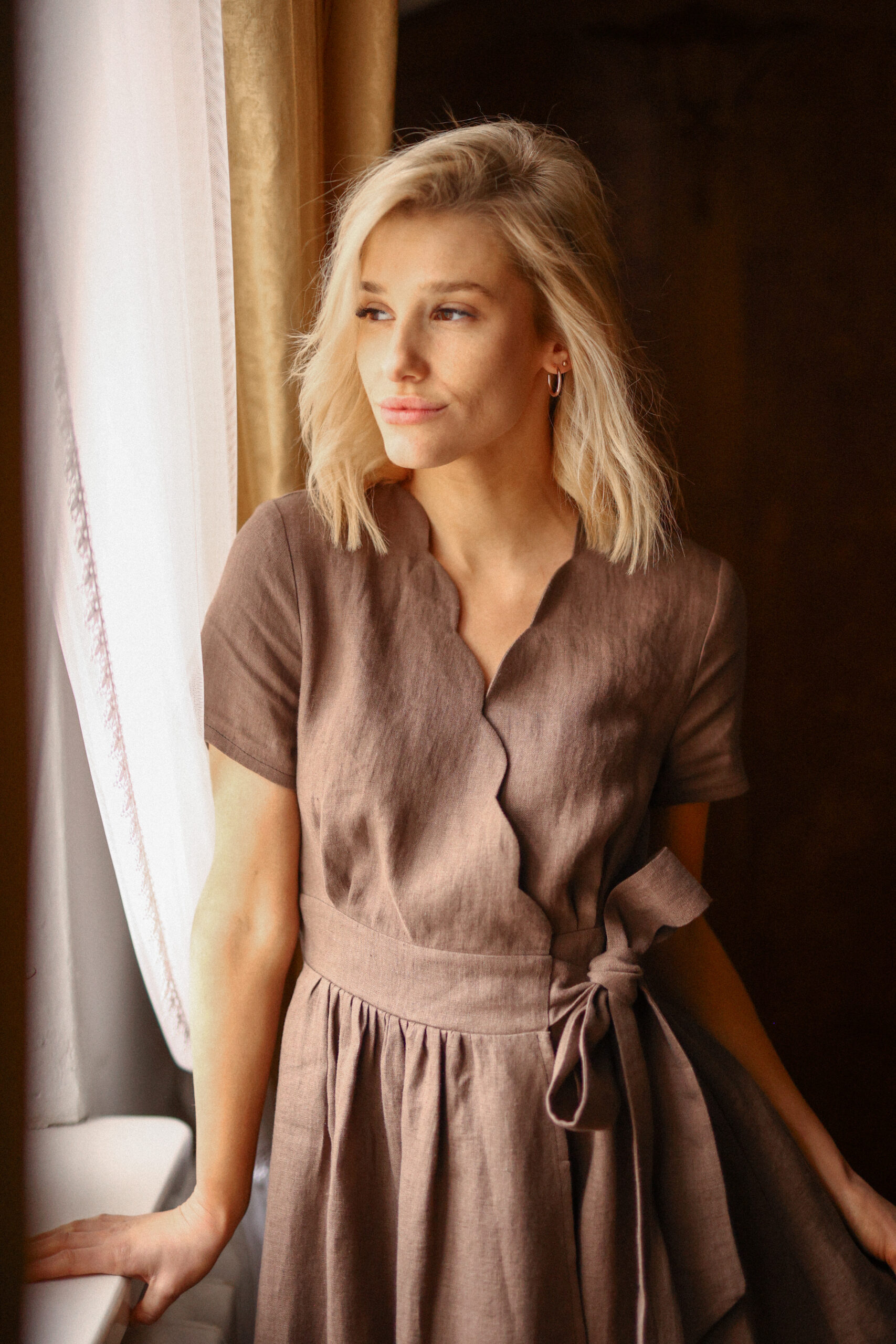 Rose – niesamowicie subtelna, zachwycająca w swojej prostocie lniana sukienka kopertowa. Tworząc Rose chcieliśmy, aby główną rolę grał dekolt wycięty w kształt falbanki. Udało się – nie możemy oderwać od niego oczu! Wszyty szeroko pasek podkreśla pięknie talię, Rose ma gładki krótki rękawek, po dwie zakładki przy biuście i marszczoną, rozkloszowaną spódnicę. Od wewnątrz sukienka posiada dodatkowe troczki, które możesz zawiązać na odpowiednią szerokość i manewrować rozmiarem sukienki.